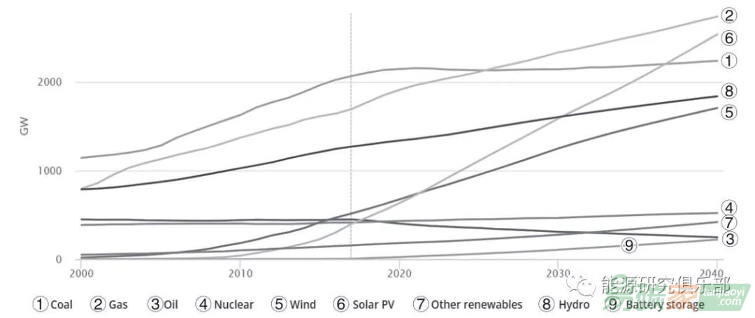 同時,太陽能光伏和天然氣正在重構(gòu)電力行業(yè)裝機容量。由于成本下降和政府優(yōu)惠政策,太陽能光伏競爭力日益增強,其裝機容量將在2025年前超過風(fēng)電,2030年左右超過水電,2040年前超過煤電。太陽能光伏和風(fēng)電的崛起,使電力系統(tǒng)的靈活性變得空前重要,以保證系統(tǒng)的穩(wěn)定運行。燃氣裝機容量將在2030年前超過煤炭,因為各國都在探索解決