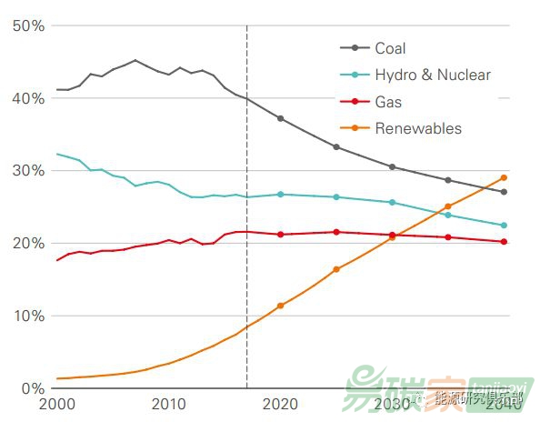 全球用于發(fā)電的燃料結(jié)構(gòu)將發(fā)生重大變化,可再生能源發(fā)電占比提高,煤電、核電和水電占比降低,天然氣發(fā)電占比大致維持在20%左右,變化情況相對平緩??稍偕茉措娏s占發(fā)電量增量的三分之二,其在全球電力部門的份額將增至30%左右。相比之下,煤電份額下降較為明顯。到2040年,可再生能源將超越煤炭,成為全球電力部門最主要的發(fā)電來源(見圖7)。