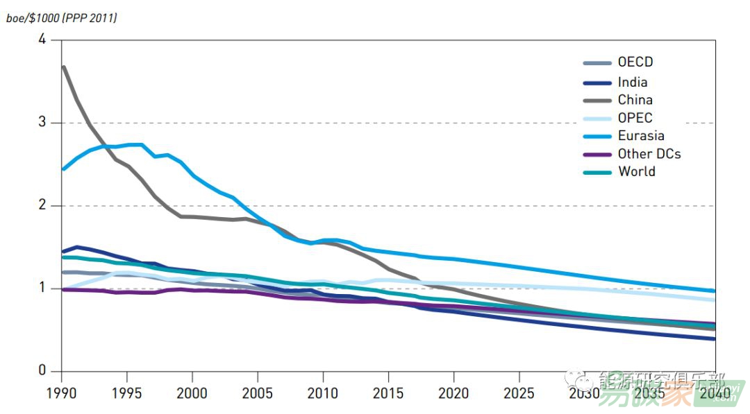 圖17 中國及其他地區(qū)核電裝機變化趨勢(三)能源強度在改善能源強度方面,隨著經(jīng)濟結(jié)構(gòu)從制造業(yè)向服務(wù)業(yè)的轉(zhuǎn)變,中國能源強度未來還將繼續(xù)穩(wěn)步下降。OPEC預(yù)測:中國能源強度年均降幅最大。