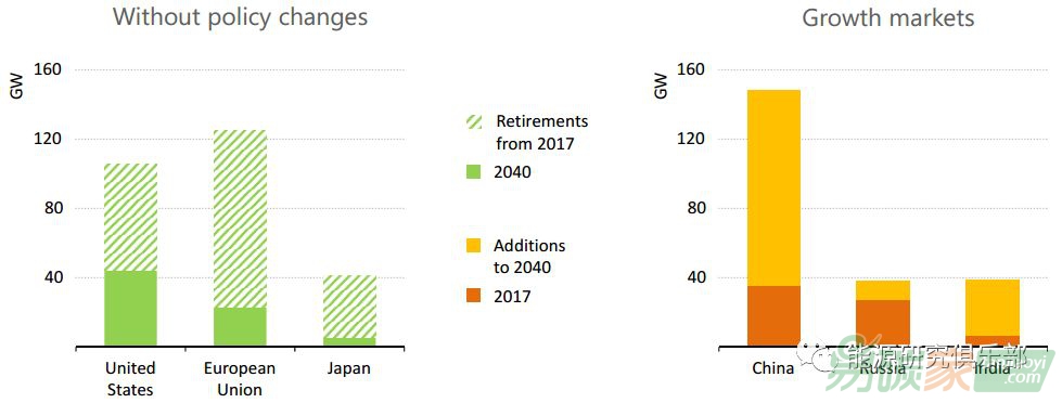 問題將部分得以解決,但與全球電氣化還相去甚遠。如表2所示,煤炭的發(fā)電量占比將從現(xiàn)在的40%左右下降到2040年的25%以下;可再生能源占比將從25%增加到40%以上;天然氣占比幾乎穩(wěn)定地保持在20%左右。水電仍然是低碳電能的最大來源。核電發(fā)電量占比將保持在10%左右,但其地理格局將發(fā)生重大變化。目前發(fā)達經(jīng)濟體約三分之二的核電站已運行30年以上,2040年傳統(tǒng)核電大國將迎來一波退役潮,屆時以中國、印度和俄羅斯為首的發(fā)展中國家核電裝機將大幅增加。