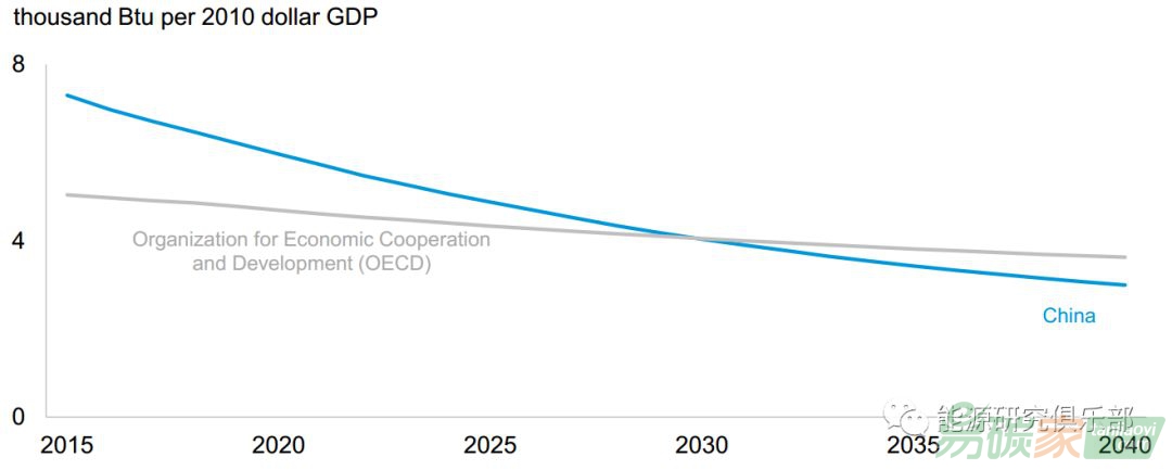 OPEC認為,以中國為代表的發(fā)展中國家在提高能效方面表現(xiàn)得尤為出色。1990~2017年間,中國能源強度年均降速超過4%。在OPEC的參考情景中,2015~2040年間,預(yù)計中國能源強度年均降幅最大,將達到3%以上(見圖9)。EIA預(yù)測:中國能源強度下降速度高于經(jīng)合組織國家。