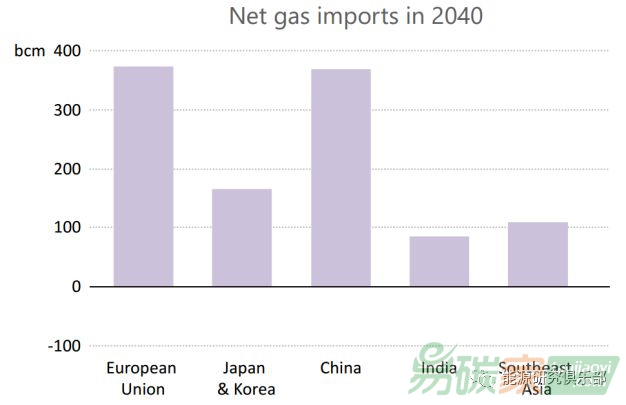 來自IEA的預(yù)測數(shù)據(jù)顯示,中國將大幅增加天然氣的進口量。以中國為首的亞洲發(fā)展中國家主導(dǎo)著長輸天然氣貿(mào)易的崛起。到2040年,中國的天然氣進口量將增至目前的3.5倍(見圖16)。屆時,中國的天然氣消費量有望超過歐盟。