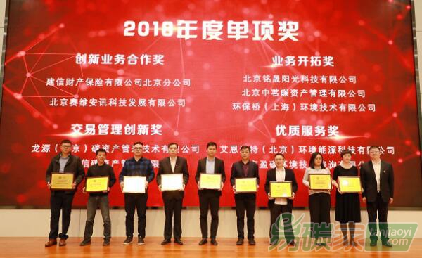 認(rèn)證集團(tuán)股份有限公司、中碳能投科技(北京)有限公司等獲選環(huán)交所2018年度“十佳會(huì)員”。九家企業(yè)榮獲四個(gè)單項(xiàng)獎(jiǎng),北京賽維安訊科技發(fā)展有限公司、建信財(cái)產(chǎn)保險(xiǎn)有限公司北京分公司獲得“創(chuàng)新業(yè)務(wù)合作獎(jiǎng)”,龍?jiān)矗ū本┨假Y產(chǎn)管理技術(shù)有限公司、上海置信碳資產(chǎn)管理有限公司獲得“交易管理創(chuàng)新獎(jiǎng)”,北京銘晟陽(yáng)光科技有限公司、北京中茗碳資產(chǎn)管理有限公司 、環(huán)保橋(上海)環(huán)境技術(shù)有限公司獲得“業(yè)務(wù)開拓獎(jiǎng)”,艾恩沃特(北京)環(huán)境能源科技有限公司、上海盈碳環(huán)境技術(shù)咨詢有限公司獲得“優(yōu)質(zhì)服務(wù)獎(jiǎng)”。龍?jiān)矗ū本┨假Y產(chǎn)管理技術(shù)有限公司總經(jīng)理魏子杰、國(guó)泰君安證券股份有限公司固定收益外匯商品部
