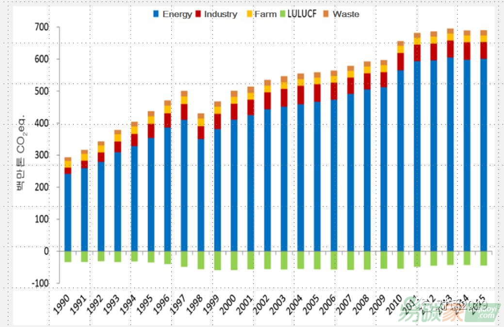 從1990年到2015年,我們一直在跟蹤韓國溫室氣體排放情況,2015年全國溫室氣體排放總量與20世紀90年代相比增加了135%,與2014年相比增加了0.2%。自2013年開始,總體排放緩慢下降。