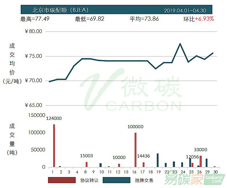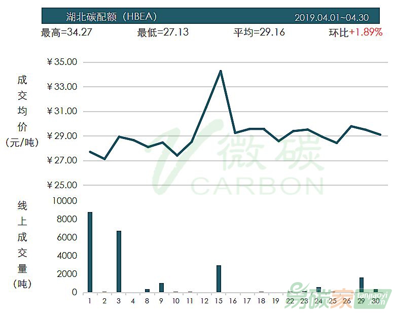 碳配額在4月中旬以連續(xù)13個(gè)漲停板拉升至30.00元/噸的價(jià)格水平;全月交易量合計(jì)僅為1.67萬噸。