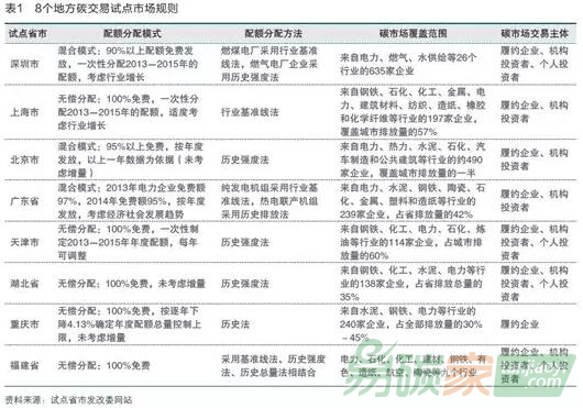 與其他國家不同,在建立全國統(tǒng)一的碳市場之前,中國政府選擇了幾個地方省市進(jìn)行碳交易試點,希望在地方試點經(jīng)驗的基礎(chǔ)上建立一個成功有效的碳市場。每個試點市場都由當(dāng)?shù)氐闹鞴懿块T根據(jù)本地情況制定規(guī)則。