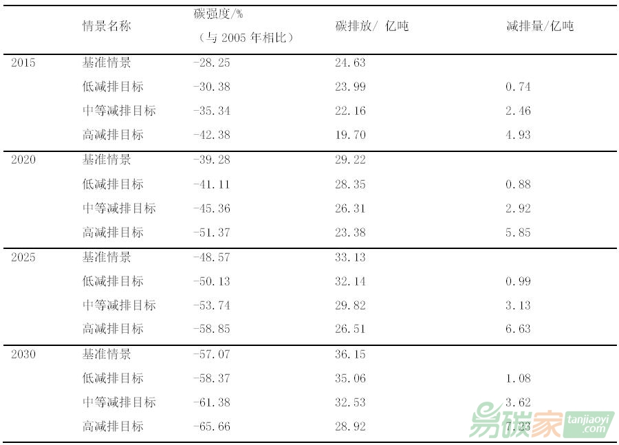 碳強(qiáng)度相對(duì)于2005 年水平逐年下降,減排初期為30.38%、35.34%和42.38%,到2030 年達(dá)到58.37%、61.38%和65.66%;減排量也呈現(xiàn)逐年上升趨勢(shì),初期為0.74 億噸、2.46 億噸和4.93 億噸,到2030 年到達(dá)1.08億噸、3.62 億噸和7.23 億噸。表4 還可以看出,低減排情景下的減排效果基本接近于基準(zhǔn)情景,成效并不是十分顯著。