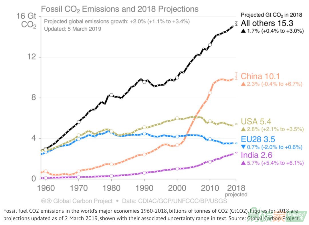 根據(jù)Carbon Brief計(jì)算,2018年美國二氧化碳排放總量54億噸(+2.8%)、歐盟排放35億噸(+0.7%)、印度排放26億噸(+5.7%),其他國家排放153億噸(+1.7%),總體上2018年全球碳排放增長2.0%。
