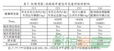 最后,低碳城市試點也可能通過改變城市交通結(jié)構(gòu)與網(wǎng)絡(luò)影響空氣質(zhì)量,具體地,可能改變公共交通網(wǎng)絡(luò),保證公共交通的通暢和便利,從而減少對私家車的依賴,來減少碳排放,也有可能通過鼓勵公眾購買清潔型能源車輛來減少碳排放。為驗證相關(guān)機(jī)制,本文選取《中國城市統(tǒng)計年鑒》中公共汽車營運車輛數(shù)、全年公共汽車客運總量以及每萬人擁有公共汽車輛數(shù)作為公共交通的代理變量。利用2009-2015年全國各城市乘務(wù)車銷售與上牌數(shù)據(jù)計算清潔型能源燃料(定義為電動或電動汽油混合)車輛所占所有車輛的比重,作為清潔型能源車輛