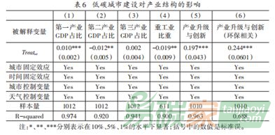 其次,低碳城市建設(shè)可能通過改變城市工業(yè)產(chǎn)業(yè)結(jié)構(gòu)、促進(jìn)城市產(chǎn)業(yè)創(chuàng)新與升級來提高空氣質(zhì)量。傳統(tǒng)產(chǎn)業(yè)可以通過技術(shù)改造實現(xiàn)低碳化升級,其他產(chǎn)業(yè)可以通過產(chǎn)業(yè)結(jié)構(gòu)的優(yōu)化發(fā)展低碳產(chǎn)業(yè),促進(jìn)城市整體的產(chǎn)業(yè)創(chuàng)新與升級,從而減少污染排放。為驗證這一機(jī)制,本文基于2005~2013年工業(yè)企業(yè)調(diào)查數(shù)據(jù)構(gòu)建了城市重工業(yè)企業(yè)比重數(shù)據(jù),同時結(jié)合城市不同產(chǎn)業(yè)占比來作為城市產(chǎn)業(yè)結(jié)構(gòu)變化的代理變量。結(jié)果在表6中匯報。列(2)中城市工業(yè)產(chǎn)業(yè)比重的系數(shù)顯著為負(fù),表明低碳城市建設(shè)顯著地減少了工業(yè)生產(chǎn)的比重約1.2%,列(4)中重工業(yè)占比的系數(shù)顯著為負(fù),表明低碳城市建設(shè)不僅顯著地減少了工業(yè)比重,更是減少了重工業(yè)生產(chǎn)的比重約1.9%。更為重要地,考慮到低碳城市設(shè)計的初衷之一是通過低碳技術(shù),促進(jìn)城市產(chǎn)業(yè)轉(zhuǎn)型升級,從而實現(xiàn)污染防治與經(jīng)濟(jì)高質(zhì)量發(fā)展的“雙贏”目標(biāo);相對應(yīng)地,本文通過由專利數(shù)據(jù)構(gòu)建獲得的城市產(chǎn)業(yè)創(chuàng)新指數(shù)數(shù)據(jù),進(jìn)一步考察低碳城市建設(shè)對于城市的產(chǎn)業(yè)創(chuàng)新與升級的影響,列(5)匯報了這一結(jié)果,發(fā)現(xiàn)低碳城市建設(shè)顯著地提高了城市總體的產(chǎn)業(yè)創(chuàng)新約 19.7%。更進(jìn)一步地,本文利用細(xì)分到產(chǎn)業(yè)—城市層面的專利指數(shù)數(shù)據(jù),利用關(guān)鍵詞(包括能源、節(jié)能、污染等)定義環(huán)境污染相關(guān)的產(chǎn)業(yè),估計低碳城市建設(shè)對環(huán)境污染相關(guān)專利指數(shù)的影響,結(jié)果在表 6 列(6)中匯報,不難發(fā)現(xiàn),其估計系數(shù)顯著為正,且在數(shù)值上大于采用總體專利估計得到的系數(shù);綜合來說,低碳城市建設(shè)一方面提高了環(huán)境污染相關(guān)產(chǎn)業(yè)的創(chuàng)新水平,利用優(yōu)化的排污或減排創(chuàng)新技術(shù),直接提高了空氣質(zhì)量;另一方面,低碳城市對于產(chǎn)業(yè)整體的升級創(chuàng)新也具有正面促進(jìn)作用。以上結(jié)果全面且穩(wěn)健地表明低碳城市建設(shè)顯著地改善了工業(yè)產(chǎn)業(yè)結(jié)構(gòu)、促進(jìn)了產(chǎn)業(yè)創(chuàng)新與升級,這也與低碳城市設(shè)計的初衷相一致。