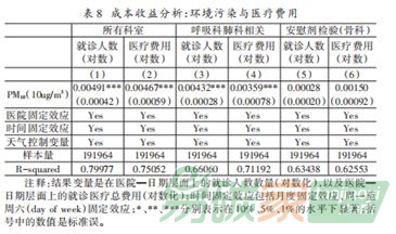 其中,i表示醫(yī)院,d 表示日期,Yid表示醫(yī)院i在日期 d 的就診人數(shù)與就診金額,pollutiond表示空氣污染程度,與主回歸模型相一致,此處使用 PM10日度平均值作為度量空氣污染的指標(biāo),W'd表示一系列的日度天氣控制變量(與上文相一致,包括溫度(攝氏度)、露點(攝氏度)、海平面氣壓(百帕斯卡)、風(fēng)速(米/秒)與降雨量指標(biāo)(毫米)),以此控制天氣的影響;f1表示空氣污染的影響方程式,比如線性方程、非線性方程等,此處使用最為基本的當(dāng)日空氣污染的線性方程式作為主回歸模型。D'包括了一系列固定效應(yīng)控制變量,包括月度固定效應(yīng)、周一至周六(day of week)固定效應(yīng)、醫(yī)院控制變量等。估計結(jié)果在表8中報告:列(1)-(2)匯報了日度空氣污染程度對總就診人數(shù)與總就診金額的影響;作為穩(wěn)健性檢驗,列(3)-(4)匯報了日度空氣污染程度對呼吸科肺科相關(guān)科室就診人數(shù)與就診金額的影響;作為安慰劑檢驗,列(5)-(6)匯報了對骨科相關(guān)人數(shù)與金額的影響;結(jié)果表明,PM10上升10μg /m3 增加總就診人數(shù)約 0.49%,增加總就診金額約0.47%。同時,發(fā)現(xiàn)其對呼吸科肺科的影響較大,相反地,對骨科的影響較小且統(tǒng)計意義上不顯著,這一結(jié)果也是符合直覺與事實的。進(jìn)一步地,結(jié)合統(tǒng)計數(shù)據(jù)(抽樣樣本中,平均每天就診總金額為 2320000 元,抽樣比例為 5%人群)與上文估計系數(shù)(9.3μg/m3),可計算得到由于低碳城市建設(shè)帶來的上海市醫(yī)療支出降低了約4.17億元。根據(jù)《中國城市統(tǒng)計年鑒》2015 年各地區(qū)醫(yī)院床位數(shù)的統(tǒng)計,可得若按4.17億元計算,利用各地醫(yī)療床位數(shù)加權(quán),計算可得低碳城市建設(shè)2010-2015年期間在全國范圍內(nèi),減少醫(yī)療支出約208.5億元。注意到此處估計的收益僅僅來自于醫(yī)療這一方面,并未考慮其他維度的收益(比如勞動生產(chǎn)率的提高、犯罪率的下降等帶來的經(jīng)濟(jì)收益),因此可視其為收益的下邊界,相對真實的收益應(yīng)該是低估的。