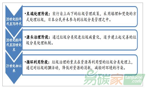 政策,集中于垃圾末端處理,填埋和焚燒是處理垃圾的主要方式,公民沒有參與垃圾分類管理之中。此后,20世紀(jì)80年代,日本處于“泡沫經(jīng)濟(jì)”時(shí)期,消費(fèi)增加使廢棄物排放進(jìn)一步增加并呈現(xiàn)多樣化的特點(diǎn),廢棄物非法排放經(jīng)常出現(xiàn)。為應(yīng)對(duì)日趨嚴(yán)重的垃圾危機(jī),日本政府及時(shí)調(diào)整垃圾管理政策,開始實(shí)行垃圾分類回收。在政府和民眾共同努力下,日本逐漸建立起了完善的垃圾分類處理機(jī)制,由末端處理轉(zhuǎn)向源頭治理。進(jìn)入21世紀(jì),日本提出建設(shè)循環(huán)型社會(huì),提倡3R原則,垃圾分類處理更加注重循環(huán)利用和資源再生。
