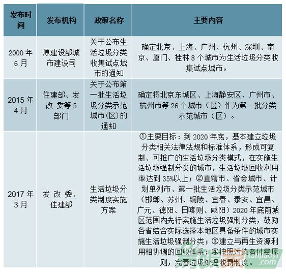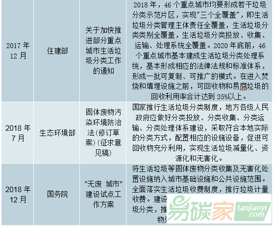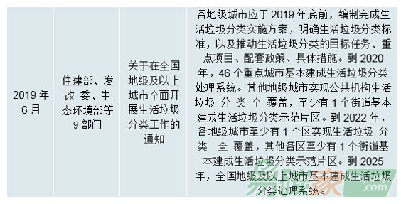 2019年全國(guó)各地級(jí)城市啟動(dòng)生活垃圾分類,編制完成分類實(shí)施方案;到2020年,46個(gè)重點(diǎn)城市基本建成生活垃圾分類處理系統(tǒng),可回收物和易腐垃圾的回收利用率合計(jì)達(dá)到35%以上,具體包括31個(gè)大陸省會(huì)城市、5個(gè)計(jì)劃單列市、邯鄲蘇州銅陵等10個(gè)城市;到2025年,全國(guó)地級(jí)及以上城市基本建成生活垃圾分類處理系統(tǒng)。