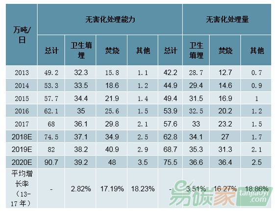 2013-2020我國(guó)城市生活垃圾無害化處理能力與處理量