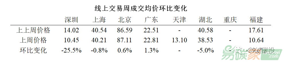 在連續(xù)兩周發(fā)生交易的區(qū)域市場中,福建市場的價(jià)格變動(dòng)幅度較大,較前一周下跌了近40%;深圳市場價(jià)格跌幅超過25%。湖北成交均價(jià)較前一周略有回落;其他地區(qū)市場價(jià)格表現(xiàn)穩(wěn)定,線上交易平均價(jià)格與前一周持平。