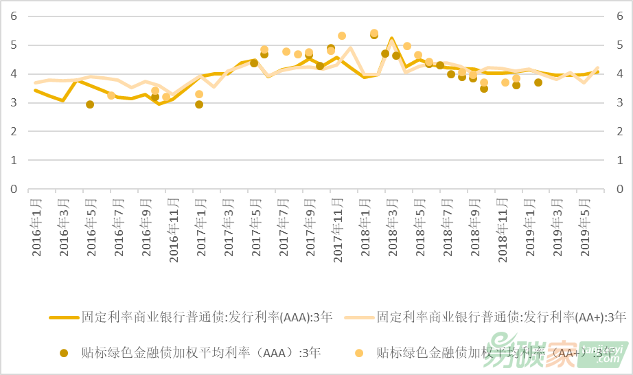 通過將最近3年以來AAA評級綠色公司債券與同類普通公司債券發(fā)行利率進(jìn)行加權(quán)比較(圖3),可以發(fā)現(xiàn)綠色公司債券的發(fā)行利率,普遍低于同類普通債券。在對AA+評級綠色公司債券與同類普通公司債券進(jìn)行對比時(圖3)可以發(fā)現(xiàn)趨同結(jié)論。