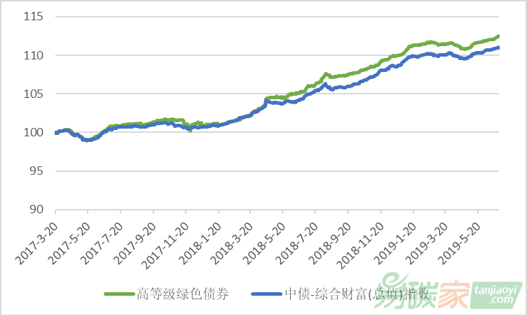 圖7 2017.3.20-2019.6.28中財-國證高等級綠色債券指數(shù)、中債-綜合財富(總值)指數(shù)走勢對比圖數(shù)據(jù)來源:Wind、中央財經(jīng)大學(xué)綠色金融國際研究院