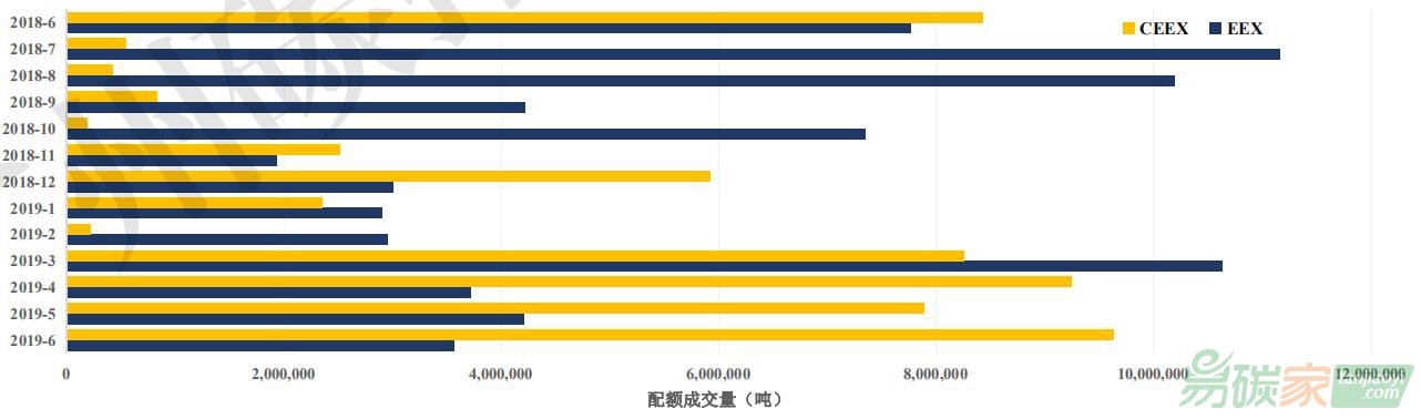 碳排放權(quán)交易所(簡稱“CEEX”)與歐洲能源交易所(簡稱“EEX”)在配額二級市場現(xiàn)貨交易量方面的差距逐步縮小,并于2019年上半年實(shí)現(xiàn)趕超。