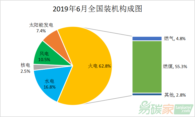 截至6月底,全國6000千瓦及以上電廠發(fā)電設備容量18.4億千瓦,同比增長5.7%。其中,火電裝機11.6億千瓦,占總裝機容量的62.8%;水電、核電、風電、太陽能發(fā)電等清潔能源裝機總容量已達6.8億千瓦,占總裝機容量的37.2%。具體構成見下圖: