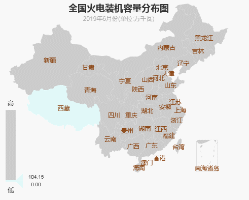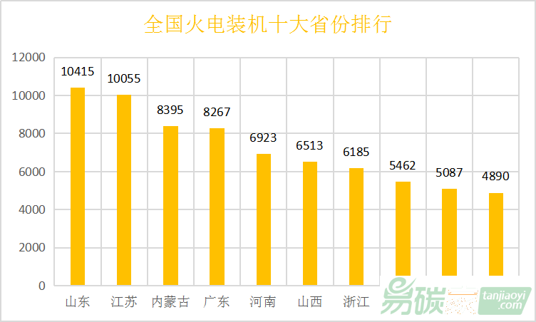 截止6月底,全國十大火電裝機省份分別是:山東10415萬千瓦、江蘇10055萬千瓦、內蒙古8395萬千瓦、廣東8267萬千瓦、河南6923萬千瓦、山西6513萬千瓦、浙江6185萬千瓦、