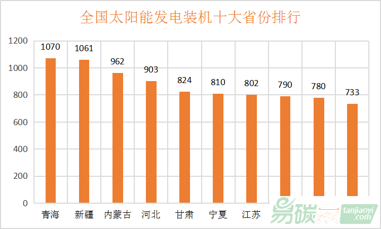 截止6月底,全國十大太陽能發(fā)電裝機省份分別是:青海1070萬千瓦、新疆1061萬千瓦、內蒙古962萬千瓦、河北903萬千瓦、甘肅824萬千瓦、寧夏810萬千瓦、江蘇802萬千瓦、山西790萬千瓦、安徽780萬千瓦、