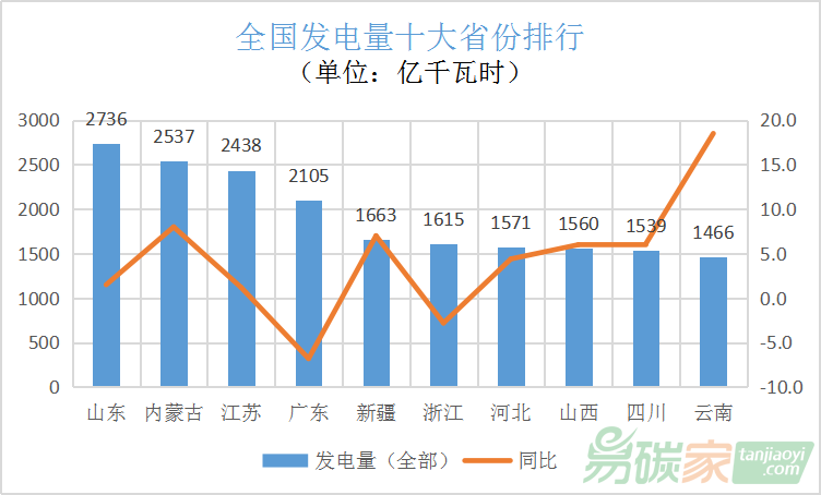 1-6月,全國發(fā)電量十大省份依次是:山東2736億千瓦時、內蒙古2537億千瓦時、江蘇2438億千瓦時、廣東2105億千瓦時、新疆1663億千瓦時、浙江1615億千瓦時、河北1571億千瓦時、山西1560億千瓦時、四川1539億千瓦時、云南1466億千瓦時。