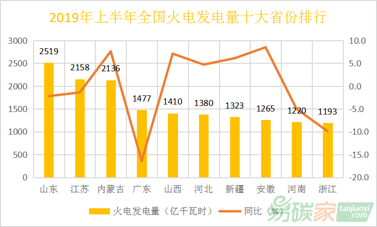 1-6月,全國火電發(fā)電量十大省份依次是:山東2519億千瓦時、江蘇2158億千瓦時、內蒙古2136億千瓦時、廣東1477億千瓦時、山西1410億千瓦時、河北1380億千瓦時、新疆1323億千瓦時、安徽1265億千瓦時、河南1220億千瓦時、浙江1193億千瓦時。