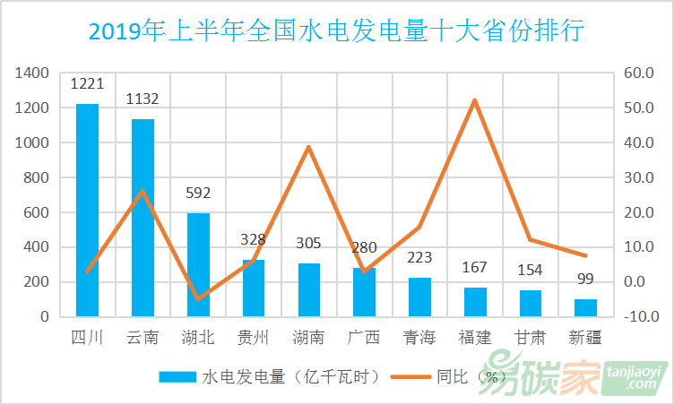 1-6月,全國水電發(fā)電量十大省份依次是:四川1221億千瓦時、云南1132億千瓦時、湖北592億千瓦時、貴州328億千瓦時、湖南305億千瓦時、廣西280億千瓦時、青海223億千瓦時、福建167億千瓦時、甘肅154億千瓦時、新疆99億千瓦時。