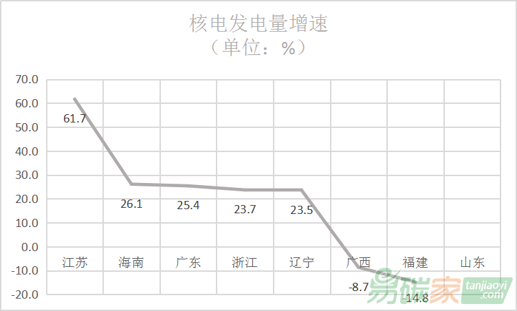 從核電發(fā)電量同比增長情況看,1-6月份,除廣西(-8.7%)和福建(-14.8%)外,其余省份核電發(fā)電量均實現(xiàn)正增長。其中,核電發(fā)電量同比增長超過全國平均水平(23.1%)的省份依次為:江蘇(61.7%)、海南(26.1%)、廣東(25.4%)、浙江(23.7%)、遼寧(23.5%)。