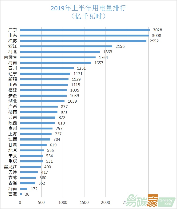 1-6月份,全國全社會用電量33980億千瓦時,同比增長5.0%。其中,廣東(3028億千瓦時)最多,山東(3028億千瓦時)緊隨其后;西藏(36億千瓦時)最少。