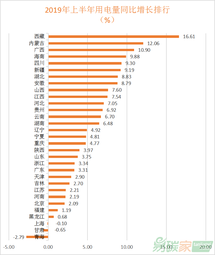 從用電量同比增長情況看,1-6月份,西藏(16.61%)增速最快,黑龍江(0.68%)增速最慢。上海、甘肅和青海3省份全社會用電量呈現(xiàn)負增長。