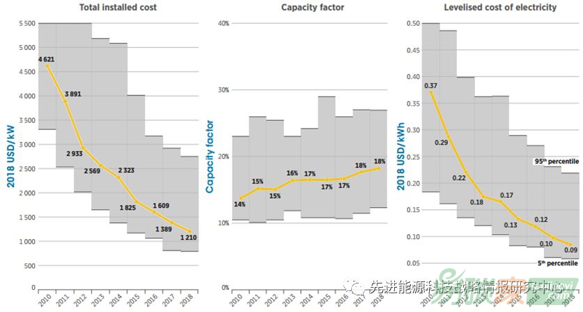 圖1 2010-2018年間太陽能光伏全球加權(quán)平均裝機成本(單位:美元/千瓦)、容量因子和LCOE(單位:美元/千瓦時)變化態(tài)勢