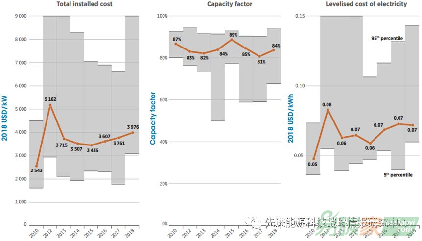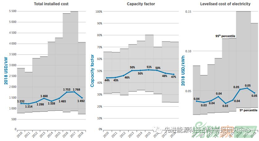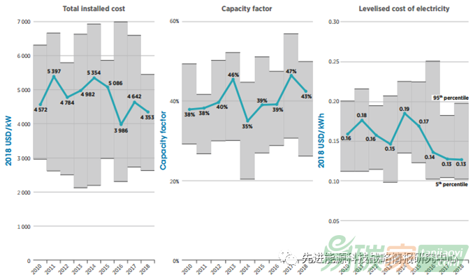 圖6 2010-2018年間地?zé)岚l(fā)電全球加權(quán)平均裝機成本(單位:美元/千瓦)、容量因子和LCOE(單位:美元/千瓦時)變化態(tài)勢