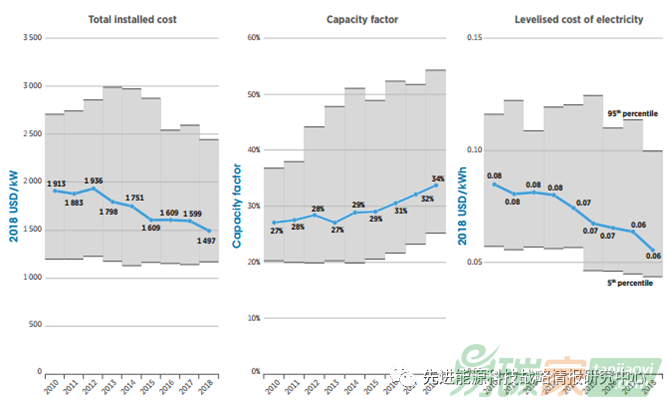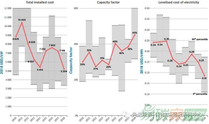 圖2 2010-2018年間CSP全球加權(quán)平均裝機成本(單位:美元/千瓦)、容量因子和LCOE(單位:美元/千瓦時)變化態(tài)勢