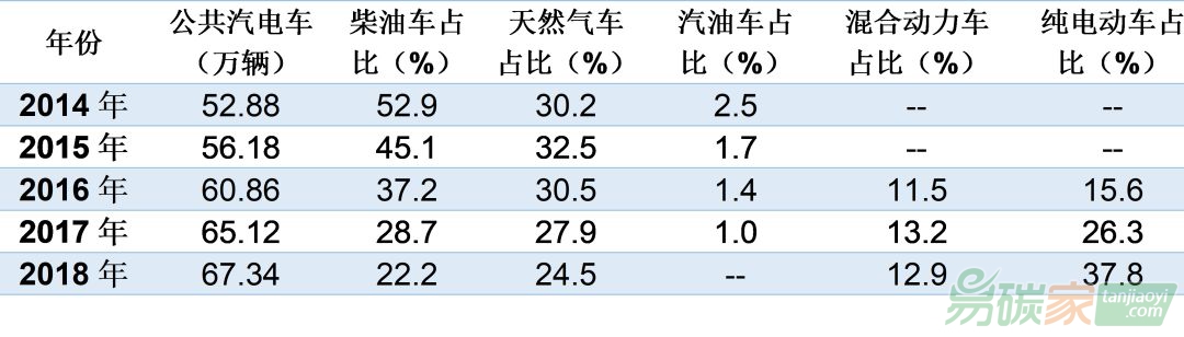 表 1 2014-2018年全國城市公共汽電車數(shù)量及車輛燃料類型分布
