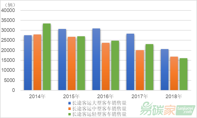 長途客運班線的需求下降直接反映在長途客車銷量的大幅減少上。2014年至2018年間,長途客運中型和輕型客車銷售量持續(xù)下滑,大型客車銷售量也在略微上升后呈現(xiàn)明顯的回落態(tài)勢??梢姡F路、高鐵等對長途公路客運的分流影響十分明顯。
