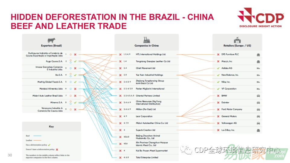 在CDP的支持下,全球林冠項目(Global Canopy)圍繞牛制品,探究了歐美品牌及中國制造商與毀林風險較高的巴西企業(yè)的關聯(lián)性。研究發(fā)現(xiàn),在中國,50%和21%從巴西進口的皮革分別被用于汽車座椅和家具的生產(chǎn);剩余的20%用于制造鞋子,箱包以及服飾。中國進口的絕大多數(shù)皮革都源于面臨高毀林風險的巴西地區(qū)。然而,目前皮革供應鏈上的大多數(shù)企業(yè)都沒有發(fā)布可持續(xù)的采購