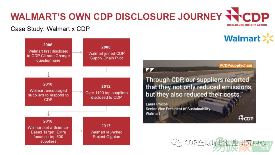 ◢2008年:沃爾瑪加入CDP供應鏈試點◢2010年:沃爾瑪鼓勵供應商響應CDP◢2012年:向CDP披露的頂級供應商超過1100家◢2016年:沃爾瑪設定科學目標。2017年,沃爾瑪啟動了“Gigaton”項目。沃爾瑪要求供應商采取積極行動,承諾在2015至2030年間減少其全球供應鏈10億噸的溫室氣體排放。該項目有6個重點關注領域,其中在能源、農(nóng)業(yè)和森林砍伐三個議題方面,CDP為沃爾瑪提供重要的供應鏈環(huán)境信息管理平臺。