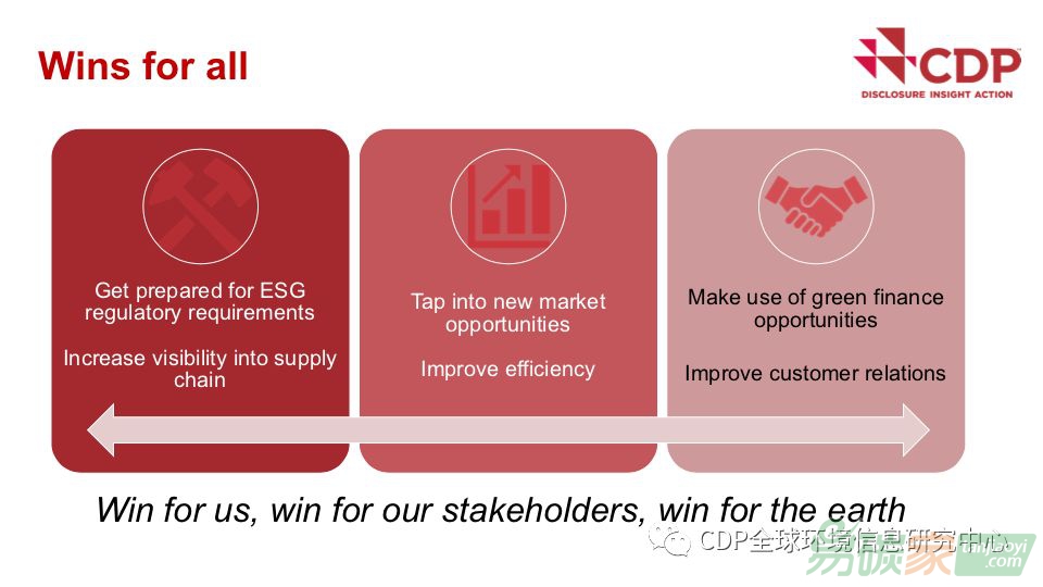 千里之行始于足下,CDP認為企業(yè)梳理自身所面臨的環(huán)境風險并進行信息披露是邁向可持續(xù)發(fā)展重要的一步。實現(xiàn)可持續(xù)商業(yè)的轉(zhuǎn)型將為企業(yè)自身,利益相關方,我們的地球,帶來利益的共贏!