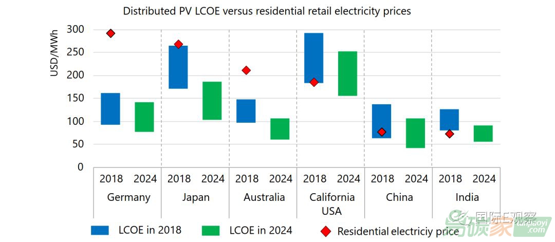 太陽能光伏發(fā)電成本的持續(xù)性下降進(jìn)一步擴(kuò)大與傳統(tǒng)發(fā)電零售價(jià)格的差距,從而提升了私營部門投資者發(fā)展分布式光伏的經(jīng)濟(jì)吸引力。 是否將迎來分布式光伏大爆發(fā)時(shí)代? 隨著政策進(jìn)一步改進(jìn),低成本和快速的發(fā)展,總的分布式裝機(jī)容量將可能在2024年前實(shí)現(xiàn)翻番。即便如此,這不過代表著全球6%的技術(shù)潛力而已。