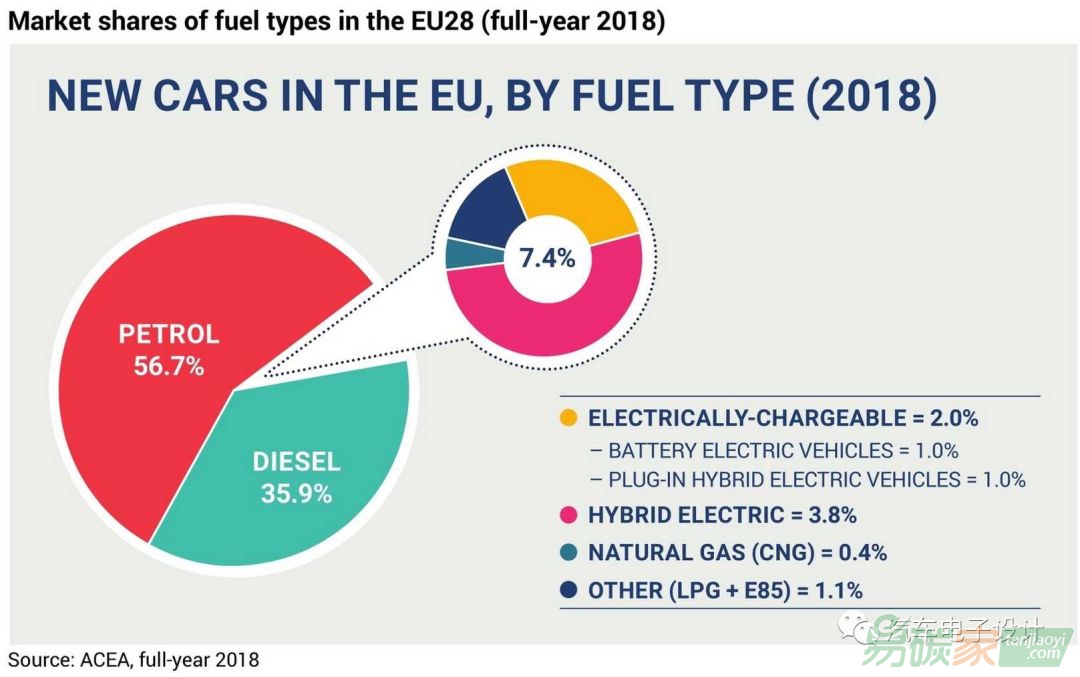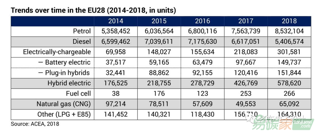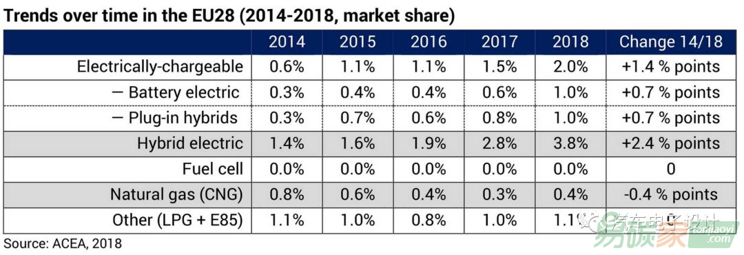 2018年歐盟有3.8%的新乘用車是混合動力汽車(比去年同期增長2.4個百分點)