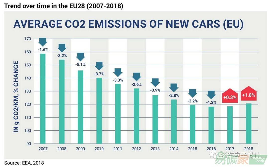 2017年新車的二氧化碳排放量首次出現(xiàn)增長(+ 0.3%),2018年柴油銷量下降幅度更大,汽油需求激增,新車二氧化碳排放量增加了1.8%