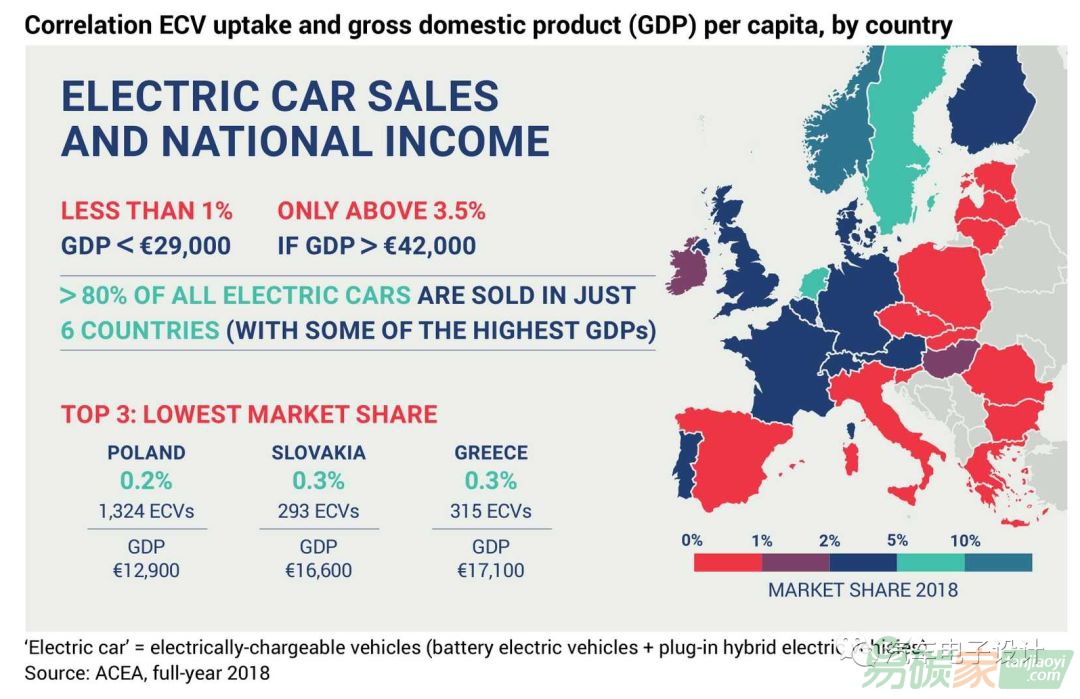 電動汽車份額超過3.5%的國家,人均GDP基本都超過42,000歐元