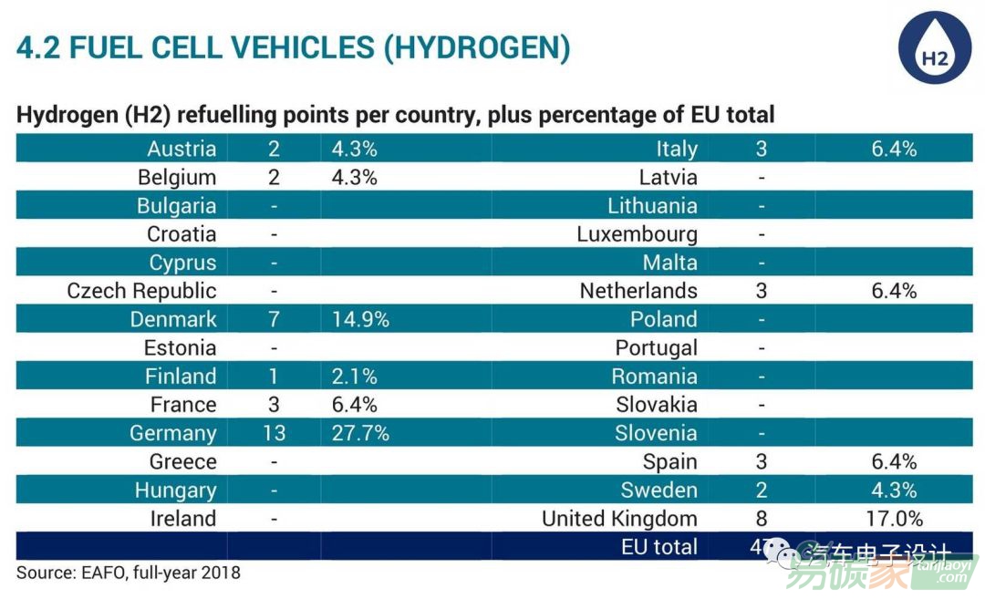 2018年,歐盟11個國家有47個加氫站,17個成員國沒有一個加氫站