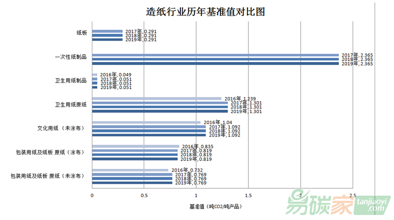 2019年度造紙行業(yè)配額分配基準線基準值較2018年度沒有變化,歷年基準值對比如下:
