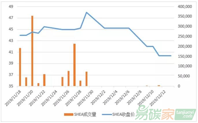 圖1 上海碳配額現(xiàn)貨價格走勢及成交量情況(2019.11.18-2019.12.13)