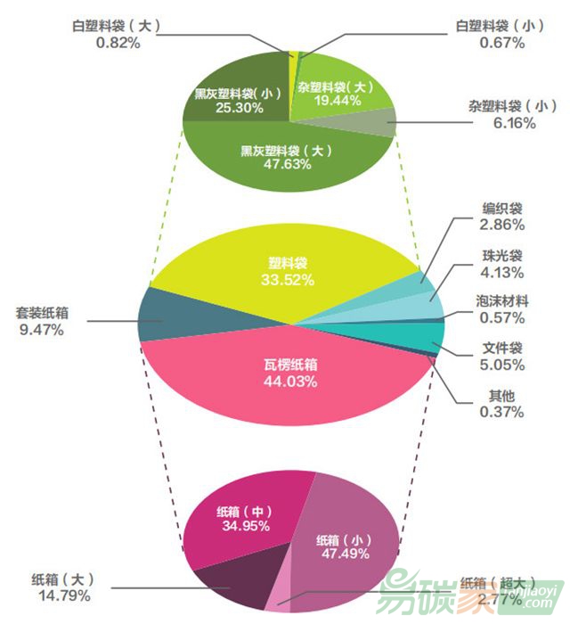 然而“三通一達(dá)”使用的快遞袋多為來(lái)源不明的再生塑料制成,雖然可以節(jié)約化石基資源,但回收、再生的過(guò)程中會(huì)引起不容忽視的環(huán)境污染。EMS 和宅急送包裝材料和“三通一達(dá)”等類似。在快遞類企業(yè)中,順豐以高端配送為主,瓦楞箱類包裝有自己的體系標(biāo)準(zhǔn),塑料類包裝也以再生塑料為主。