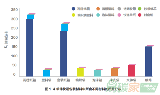 快遞包裝材料主要包括瓦楞紙箱,塑料袋,膠帶,快遞運(yùn)單以及填充物等。瓦楞紙箱快遞包裝的平均質(zhì)量是 329 g,其中瓦楞紙 304 g,填充薄膜塑料16.8 g,塑料膠帶 2.7 g, 運(yùn)單紙 4.5 g,膠帶芯廢棄量為 0.22g ( 以上數(shù)據(jù)都已依據(jù)材料規(guī)格加權(quán)處理 )。其他包裝類型所含不同組成的質(zhì)量分布參見圖 1-4。