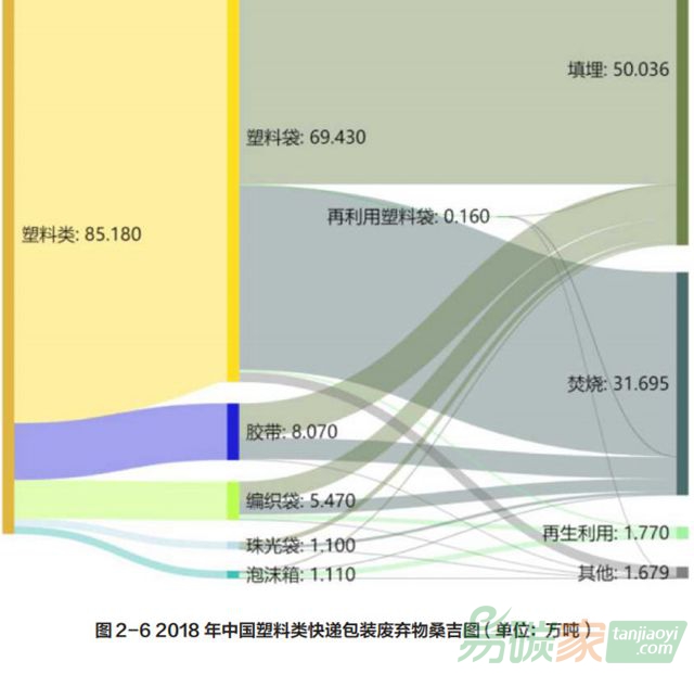 塑料類包裝材料中只有泡沫箱得到較多回收,回收率約為 70-80%,未回收的則混入生活垃圾。而質(zhì)量占比約 95% 的快遞塑料包裝袋因?yàn)榛厥諆r(jià)低,且粘貼了塑料膠帶和運(yùn)單,現(xiàn)有的回收渠道無(wú)法處理,最終會(huì)和生活垃圾一起被焚燒或填埋。以 2018 年為例,我國(guó)快遞行業(yè)共消耗塑料類包裝材料 85.18 萬(wàn)噸,其中塑料薄膜袋(包括填充薄膜)69.43 萬(wàn)噸,編織袋 5.47 萬(wàn)噸,珠光袋 1.11 萬(wàn)噸,泡沫箱 1.10 萬(wàn)噸,膠帶 8.07 萬(wàn)噸。
