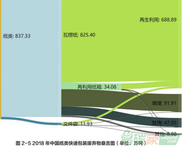調(diào)查發(fā)現(xiàn)快遞紙箱類包裝廢棄物只有不到 5% 被重復(fù)使用,按重量計(jì)算約有 80% 的紙箱被回收,還有約 15% 混入生活垃圾。以 2018 年為例,我國(guó)快遞行業(yè)共消耗紙類包裝材料 837.33 萬(wàn)噸(不包括快遞單號(hào)紙),其中文件袋用紙 11.93 萬(wàn)噸,瓦楞紙箱、紙筒和膠帶芯等瓦楞紙消耗量 825.40 萬(wàn)噸。這其中僅有約 34.08 萬(wàn)噸的瓦楞紙箱被重復(fù)使用,通過(guò)流動(dòng)回收業(yè)者回收的約有 688.89 萬(wàn)噸快遞包裝廢紙(瓦楞紙 679.43 萬(wàn)噸,文件袋 9.46 萬(wàn)噸)。計(jì)算得到快遞紙類包裝產(chǎn)生量和流量信息如圖 2-5 所示: